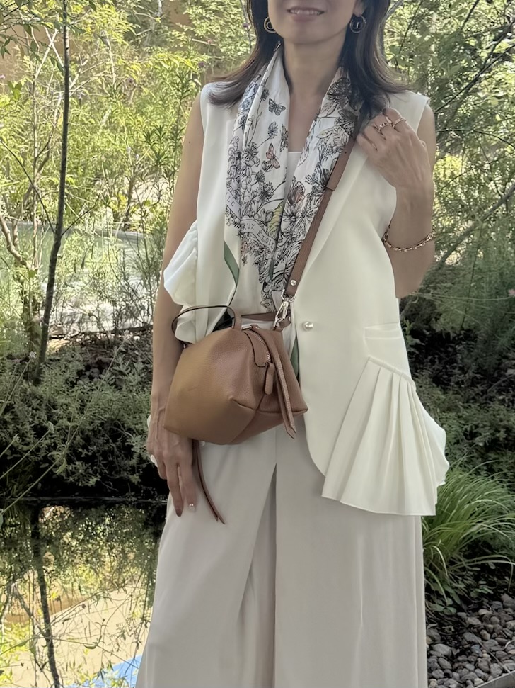 軽やかな着こなしに、深みのあるバッグやスカーフで季節を先取りするのがポイントです。