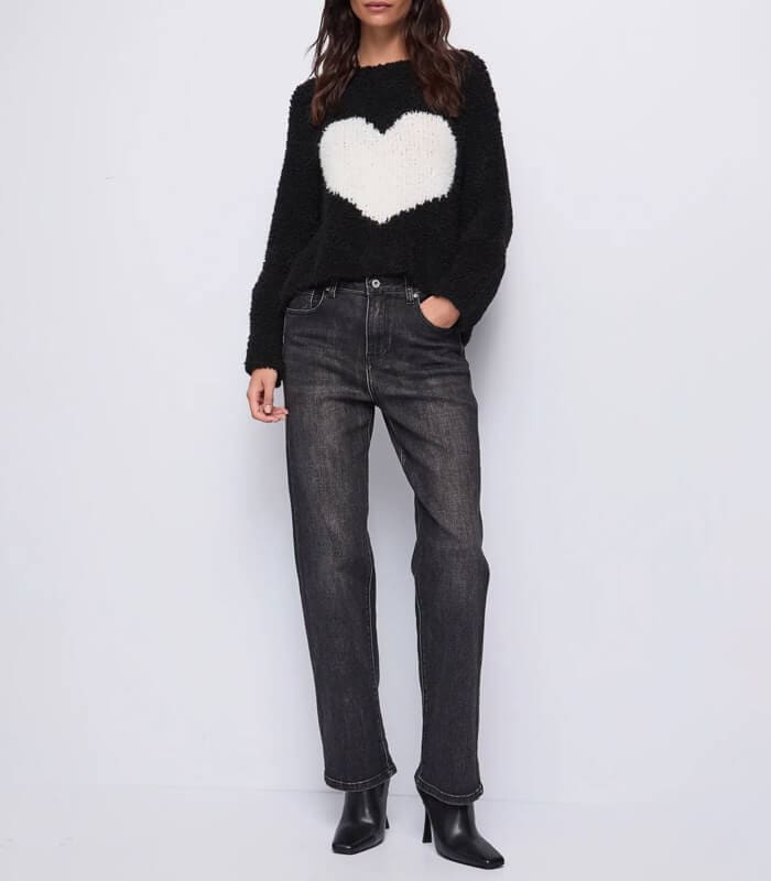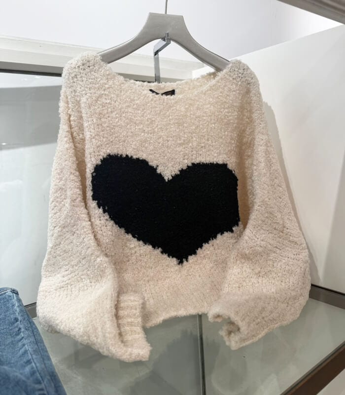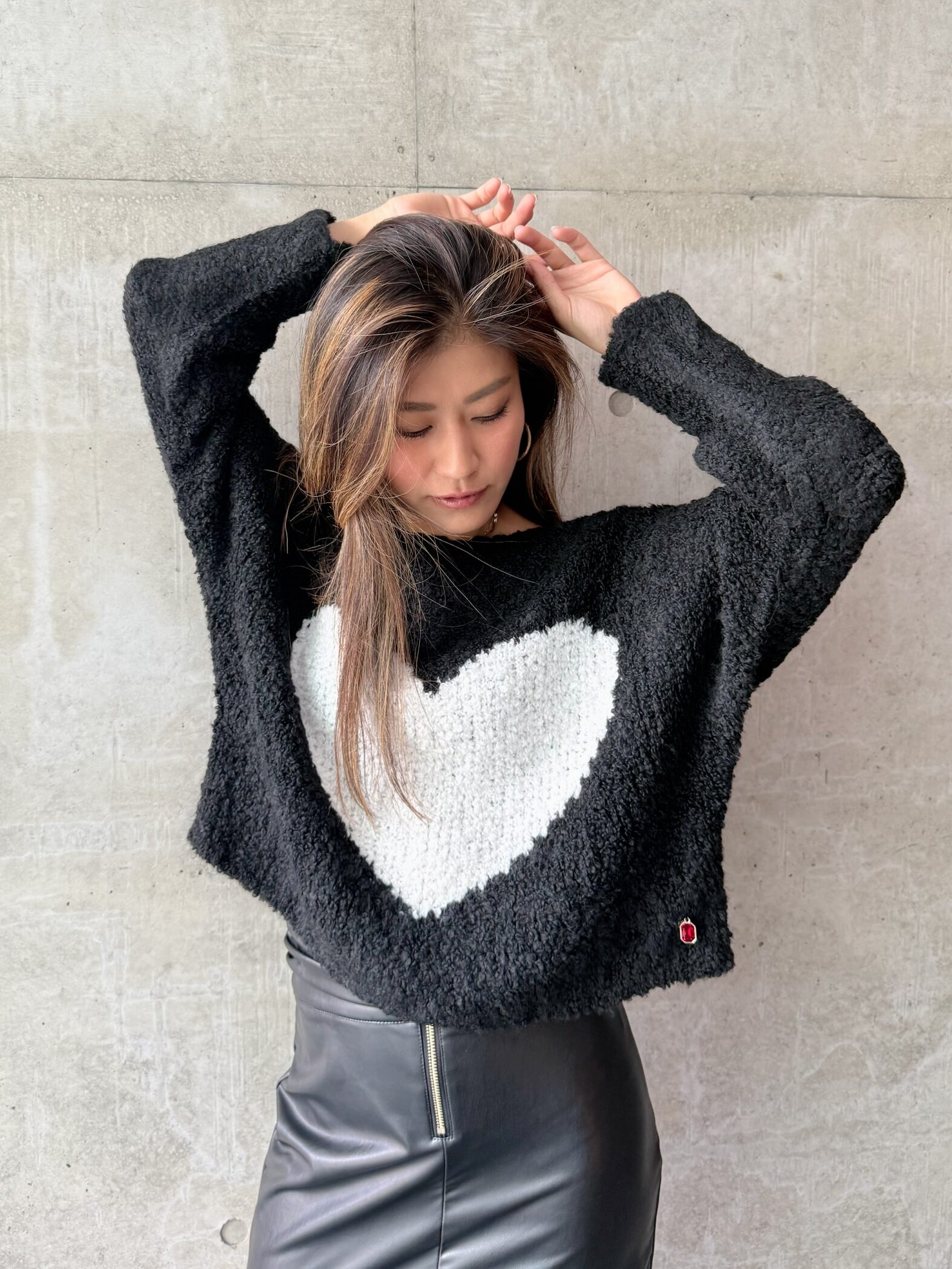 胸元に大きなハートが編み込まれた遊び心満点のニット。