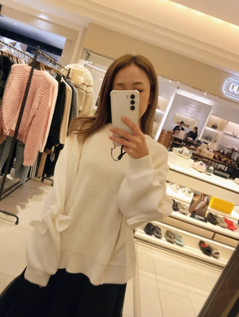 ③ 袖リボンニットで甘さをひとさじ
