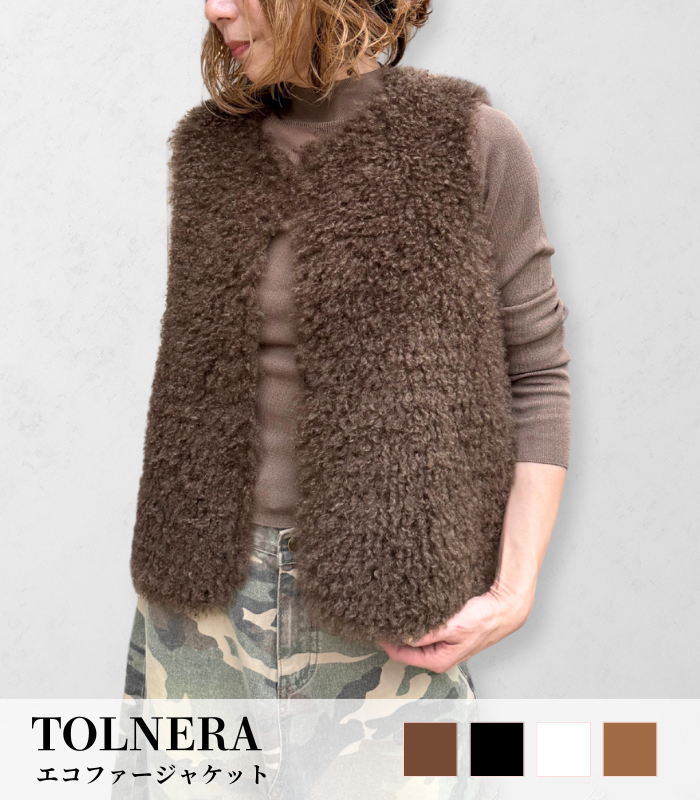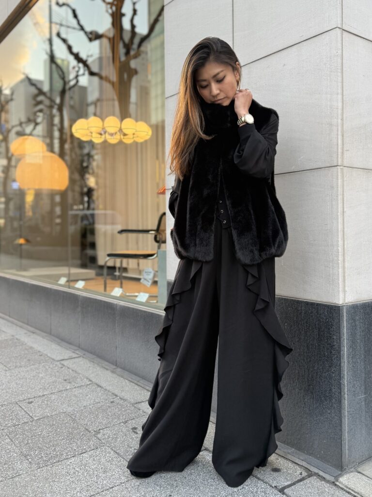TOLNERA ショールカラーファーベスト × オールブラックスタイル