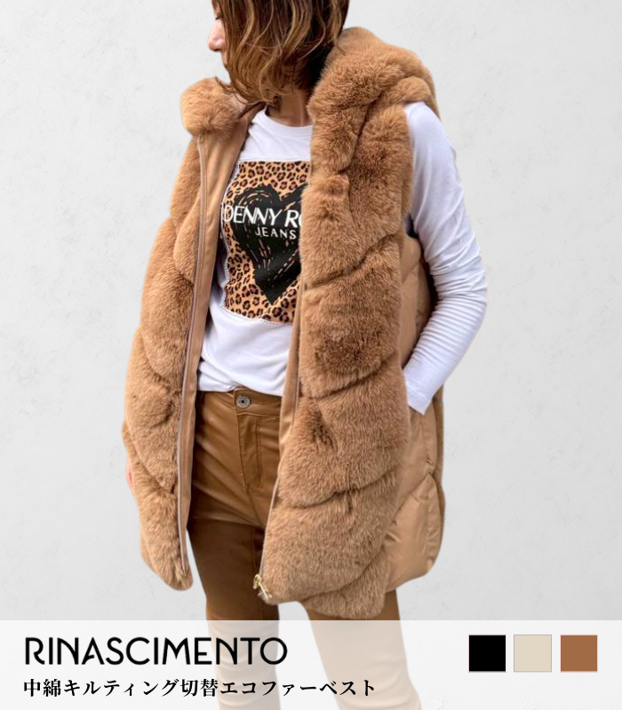 RINASCIMENTO 中綿キルティング切替ロングファーベスト × デニム調パンツ