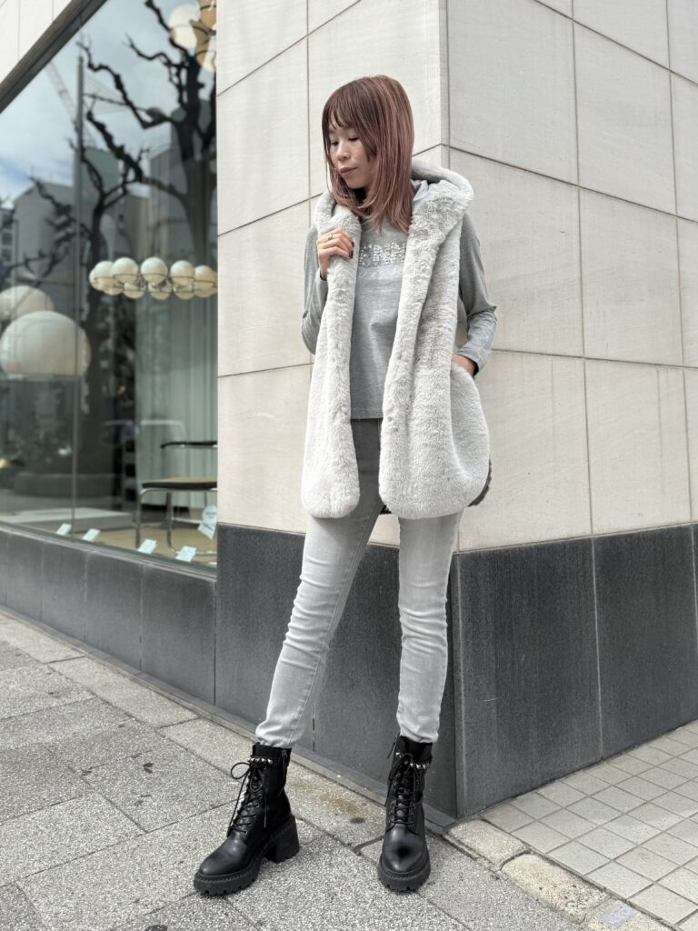 スウェット合わせでリラックス感を出しつつ、光沢ファーが高見えを叶えます。