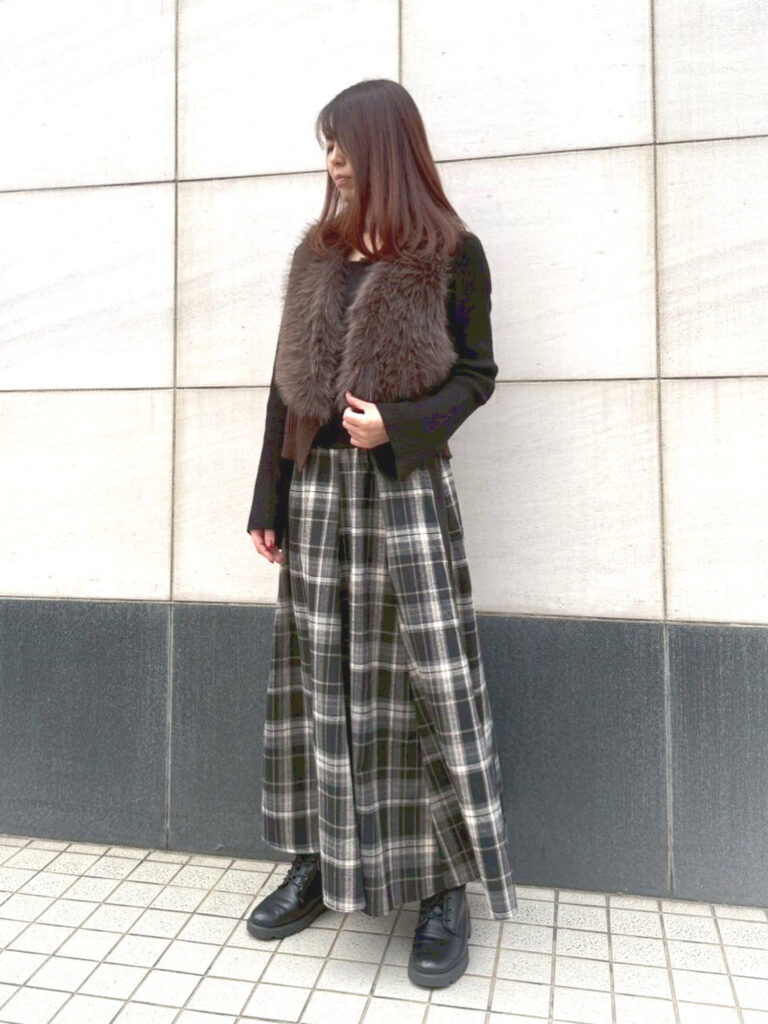 ✔ ファーベストやショートブーツを合わせて、秋らしい質感をプラス。