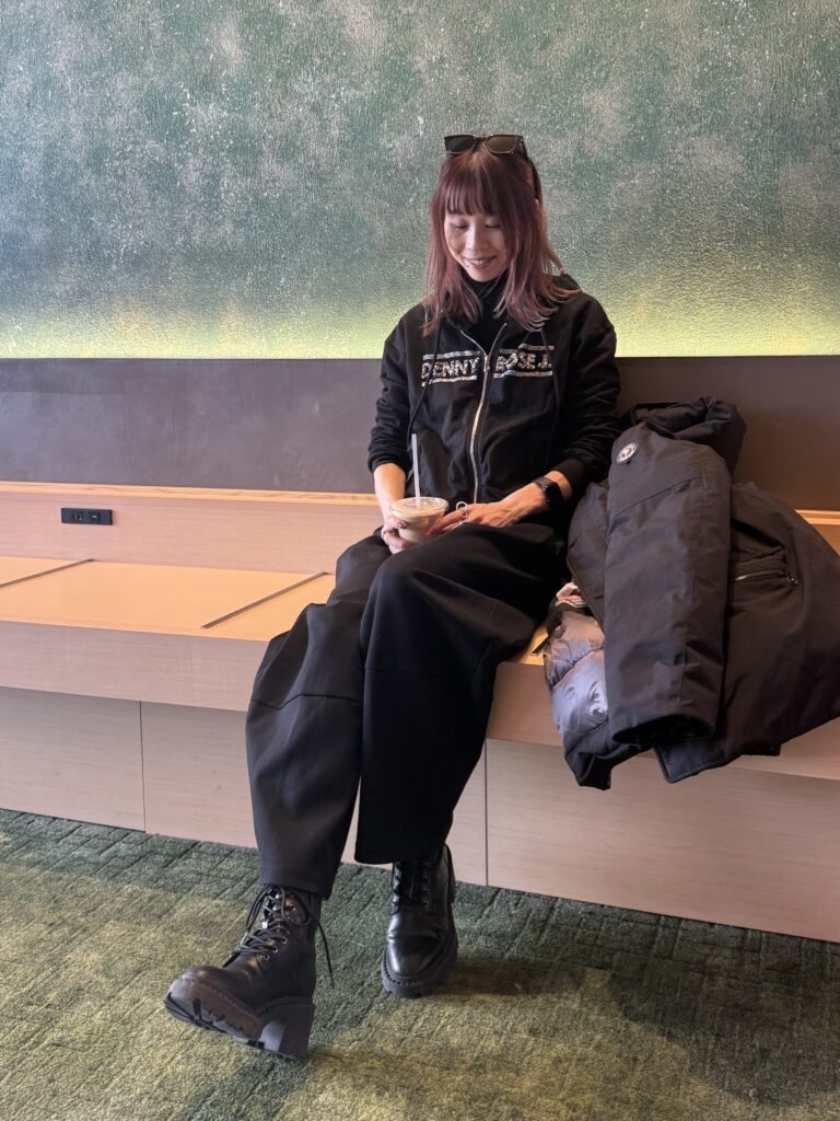 • モノトーンでまとめて大人っぽく、空港でも存在感のあるクールな印象に