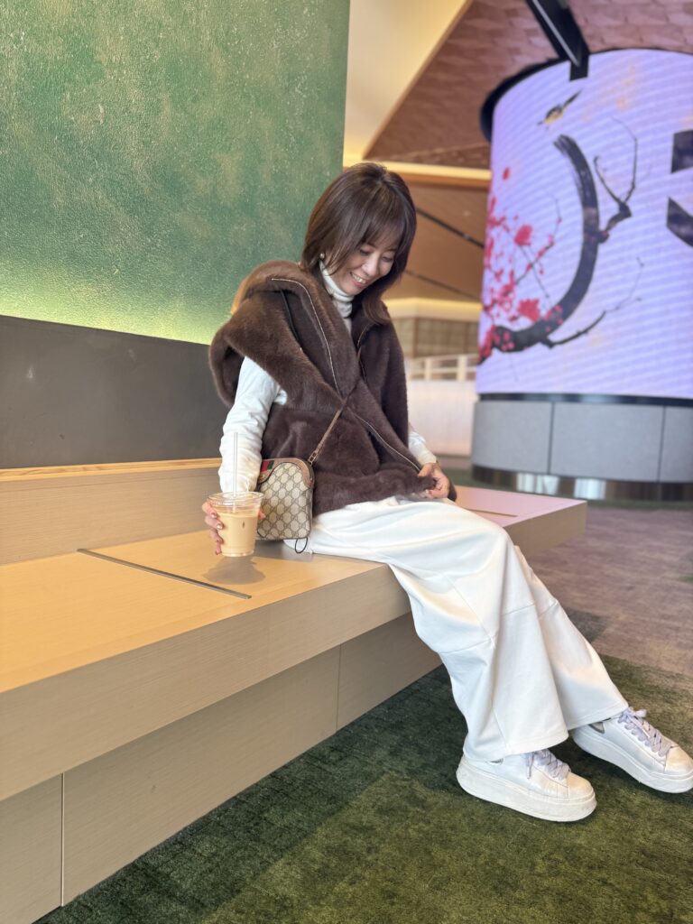 • ホワイトスニーカーで統一感を出し、クリーンな冬の空港コーデに仕上げて