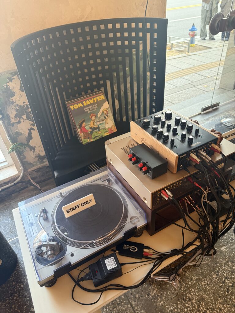 店内はアンティークの壁や棚に並ぶ器、レコード機材などが印象的で、