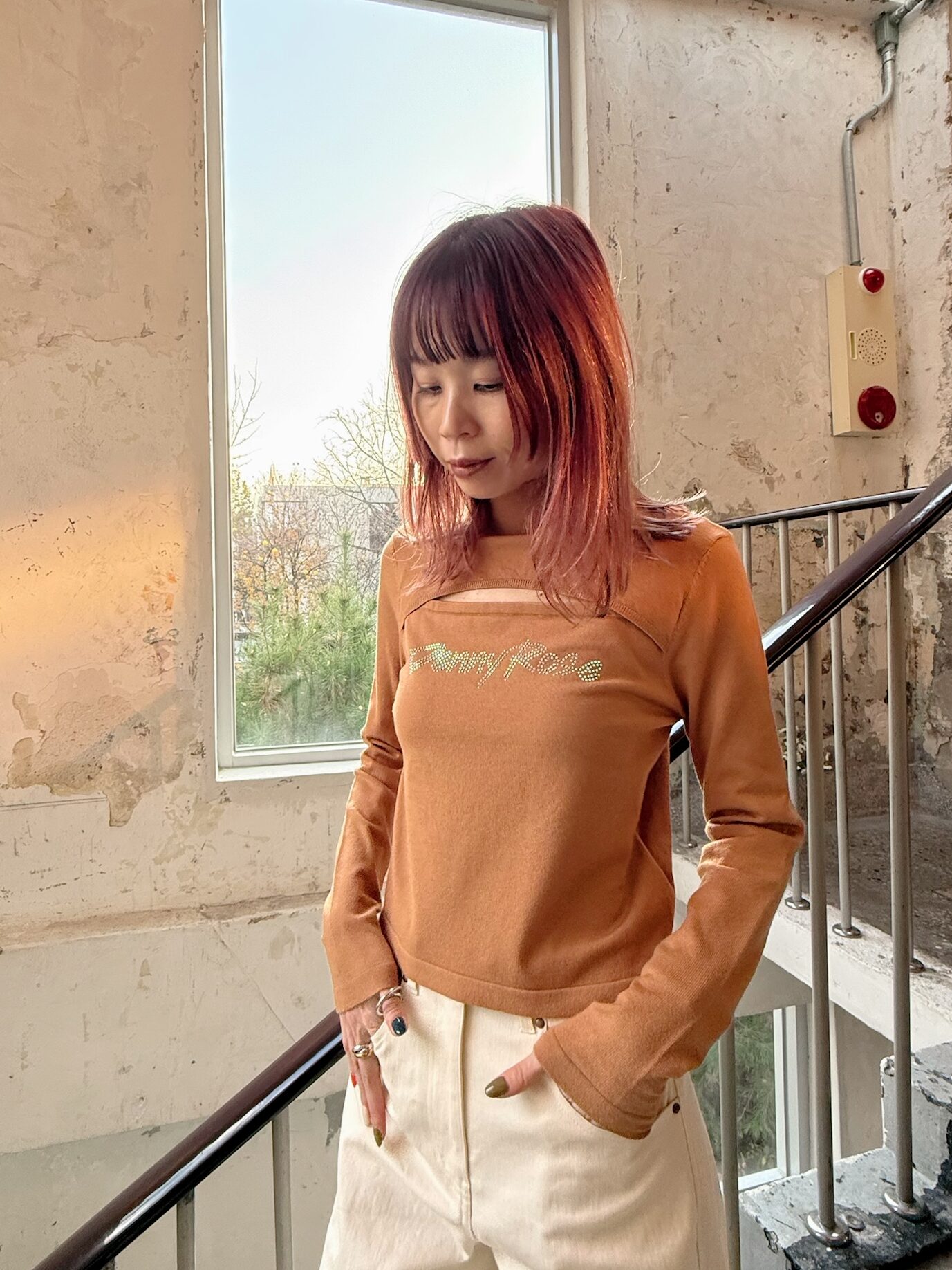 ロゴラインストーンポイント バストカットアウトニット