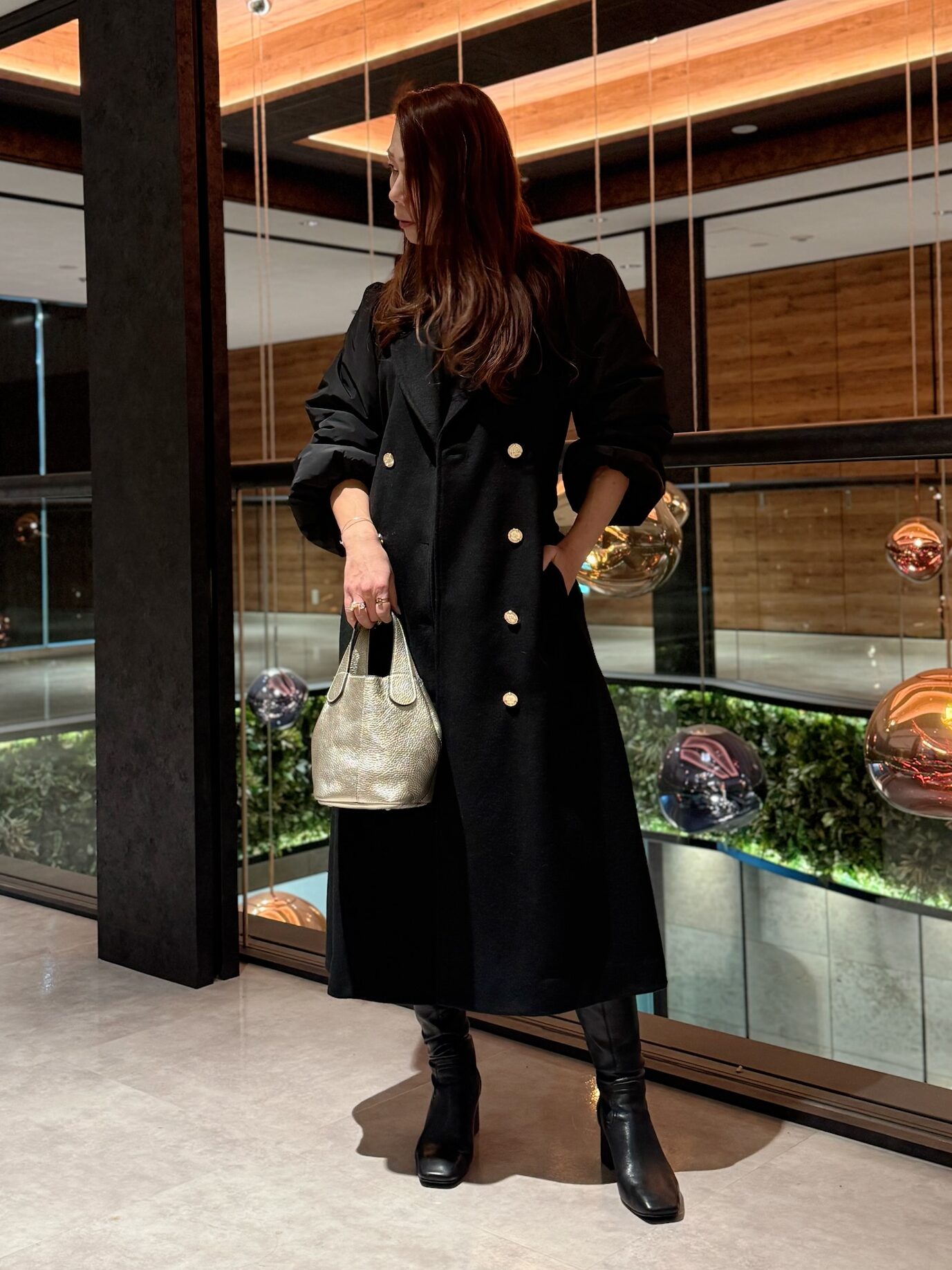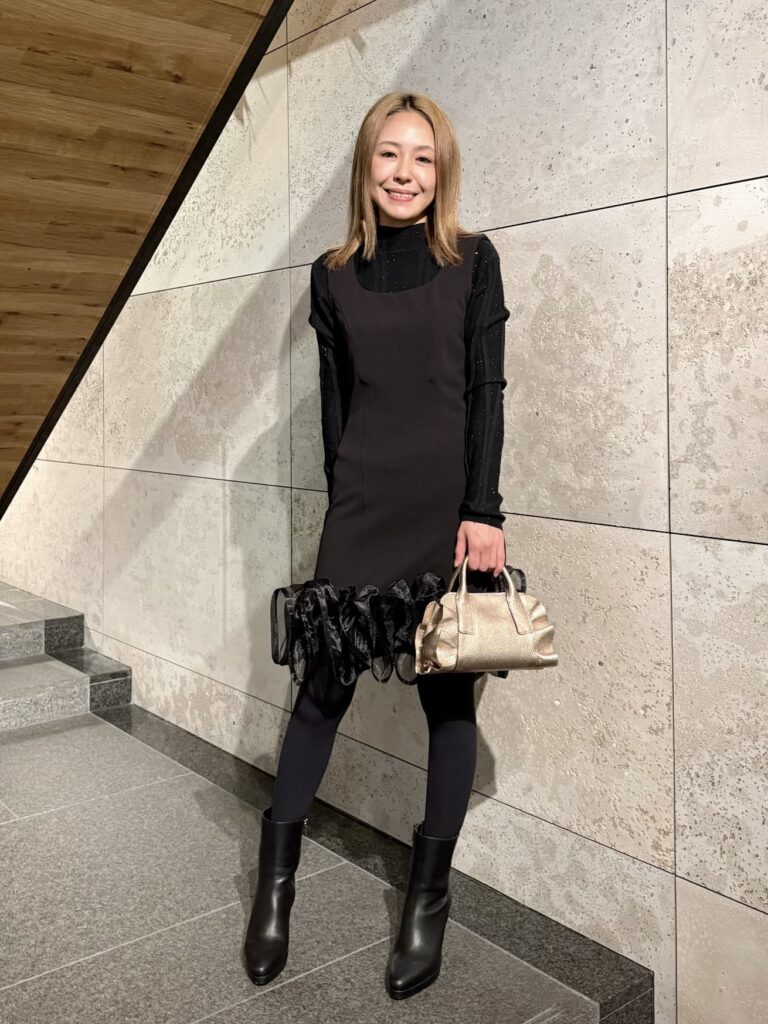 この違いが、コーディネートに自然な立体感を生み出します。ホリデーシーズンのお食事や、少しきれいめなお出かけにもおすすめのスタイリングです。