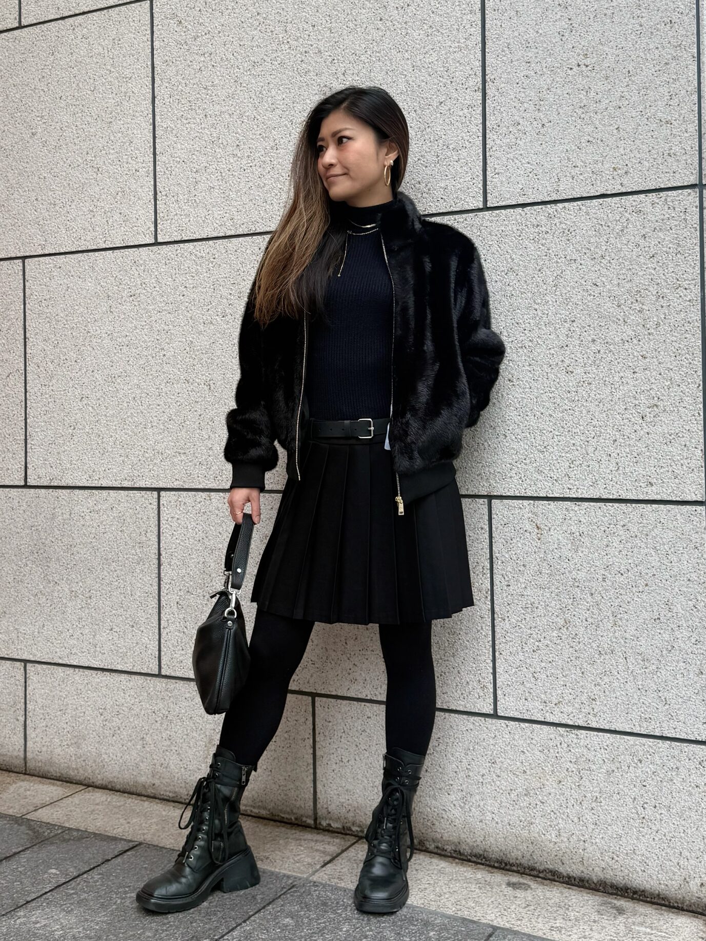 今回はワンピースもアウターもブラック という上級者コーデを、素材のコントラストで楽しみます。