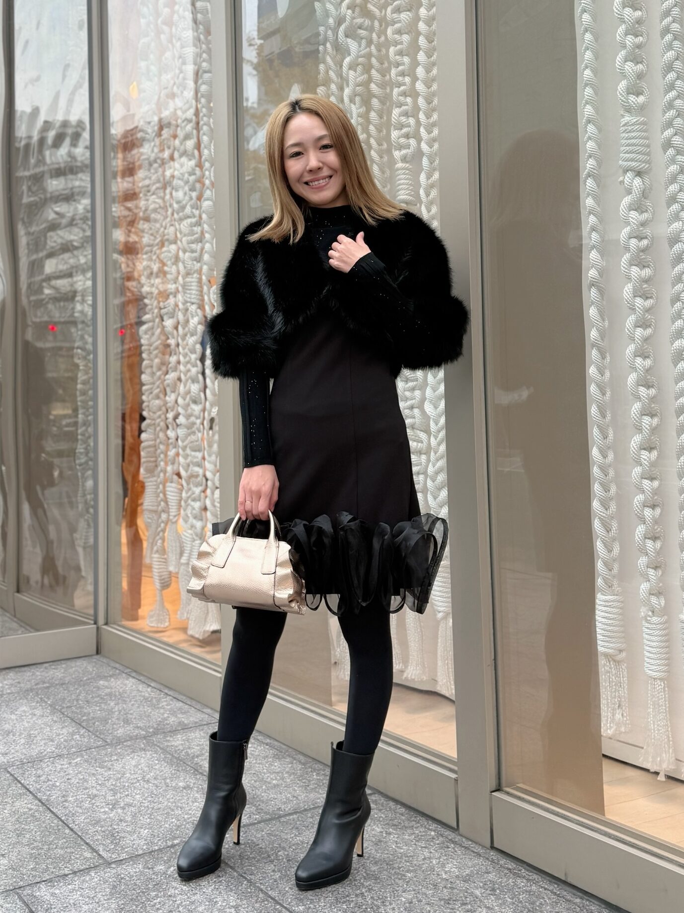 ブラックワンピース × ファーボレロ のスタイル。