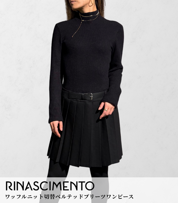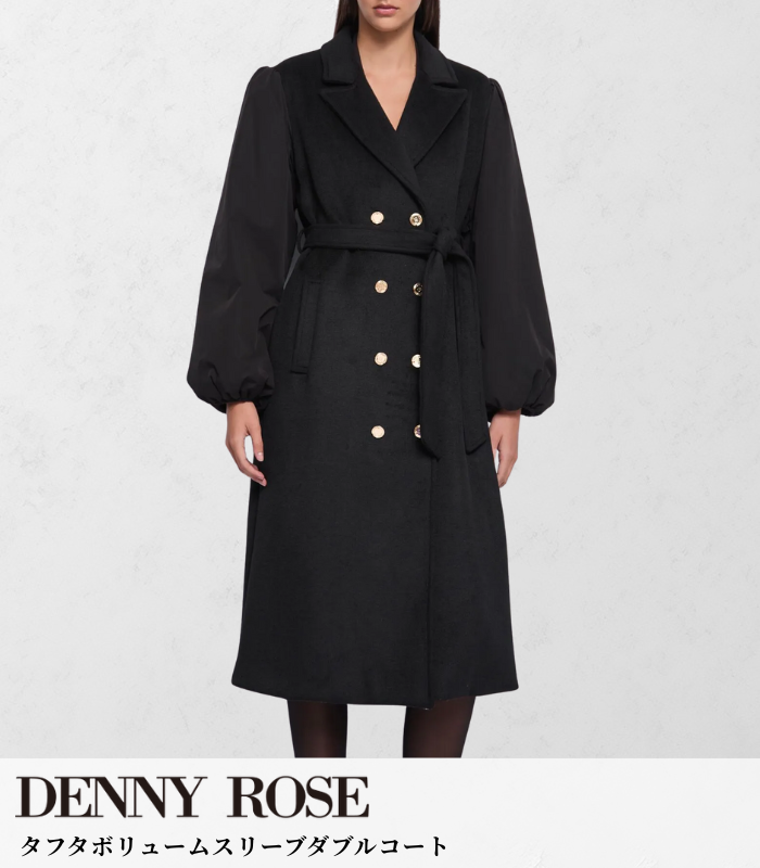 ワンピースはRINASCIMENTO(リナシメント)。シンプルな中にも、シルエットの美しさや女性らしさが際立つ一着です。そこに合わせたのは、今回主役となるDENNY ROSE(デニーローズ)ブラックのアウター。