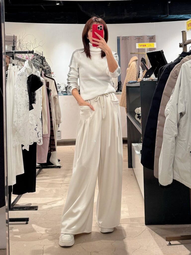 ヒップから太ももにかけて立体的なカーブを描くシルエットで、ワイドなのに「脚がきれいに見える」と評判の一本です。