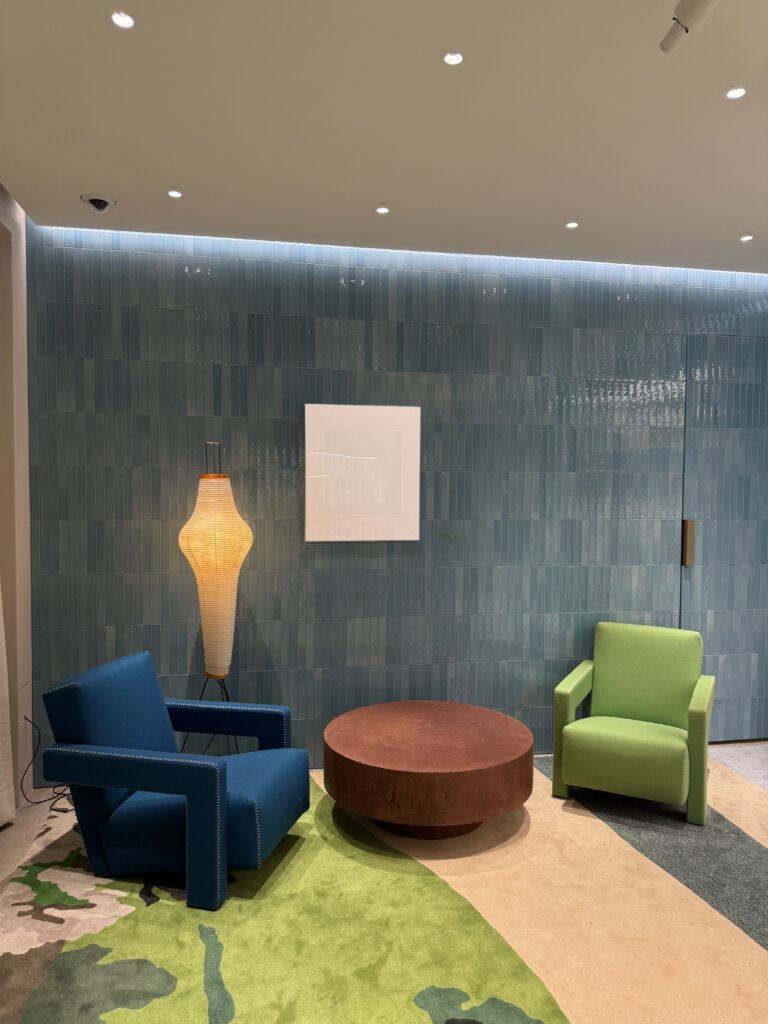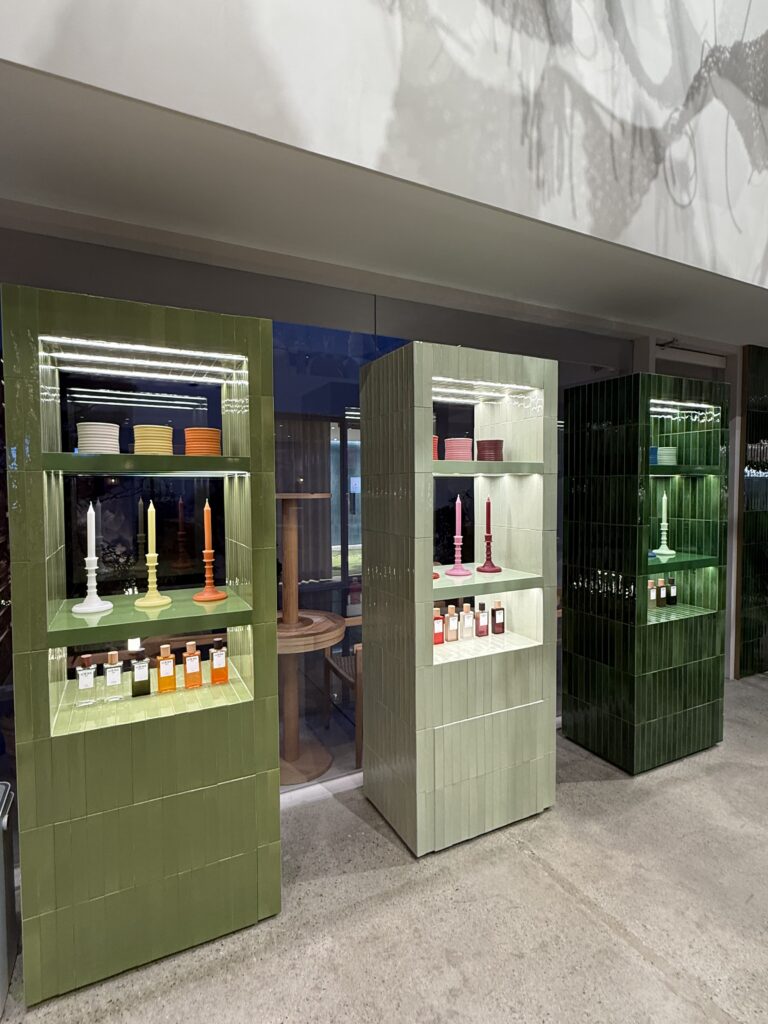 グリーンタイルの外壁と大きく光るLOEWEのロゴが印象的で、思わず写真を撮りたくなるデザインです。