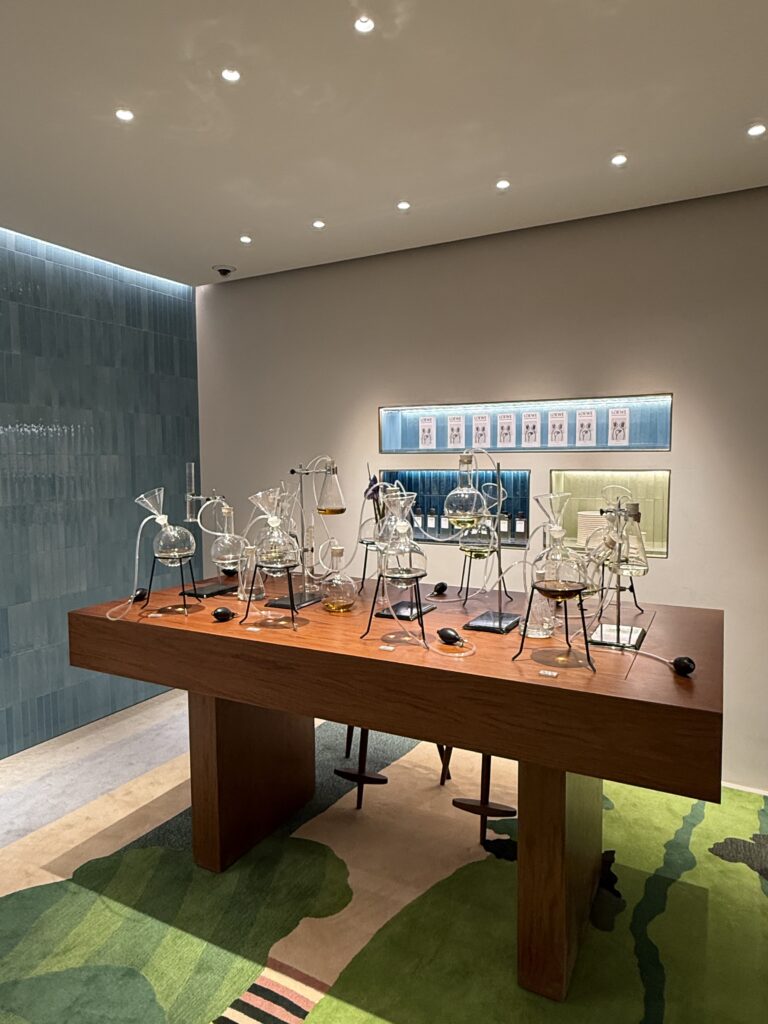ガラスのフラスコや器具が並ぶテーブルは香りが作られる世界観を感じられる演出。