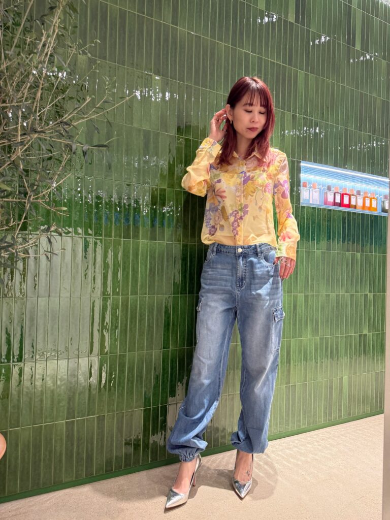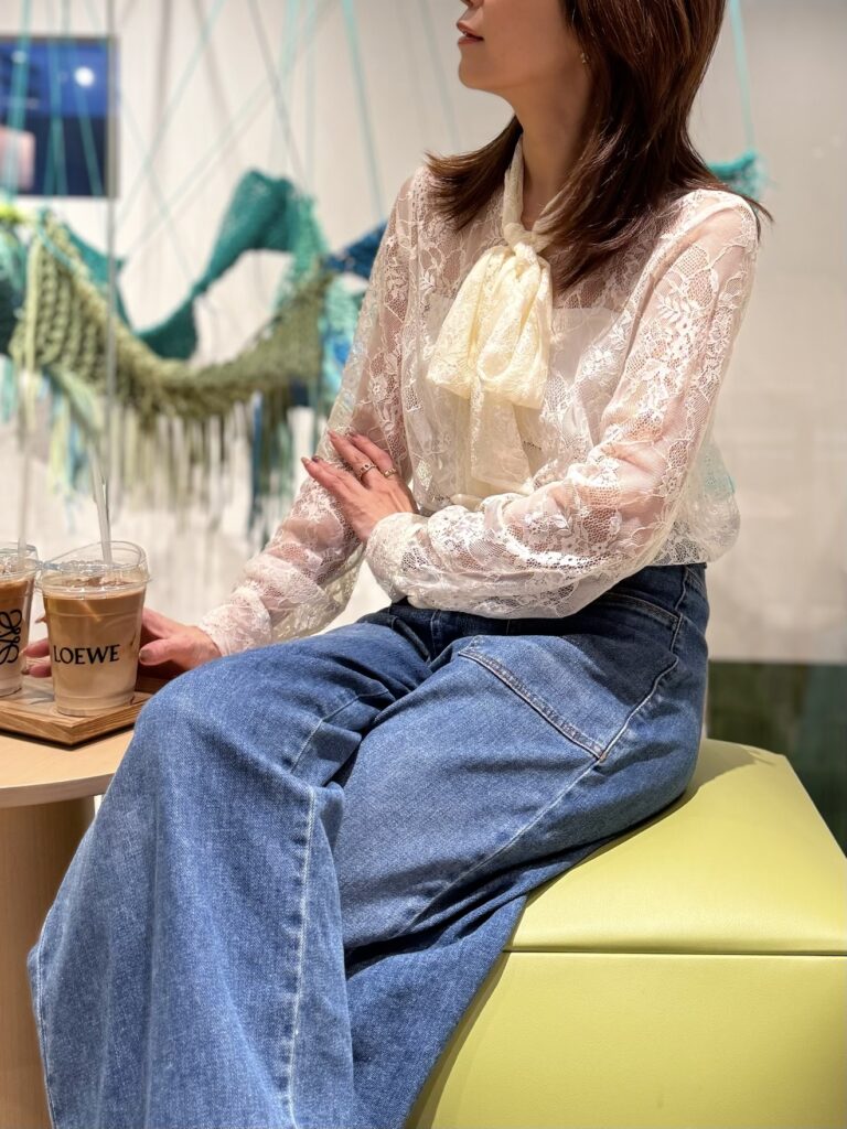 今回のコーデはデニムに華やかなブラウスやレースブラウスを合わせた
